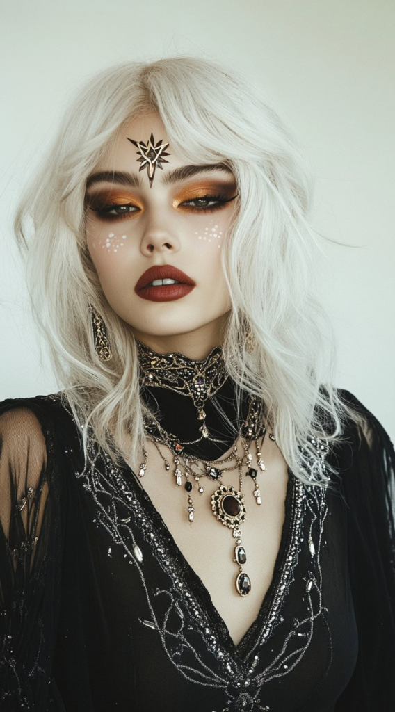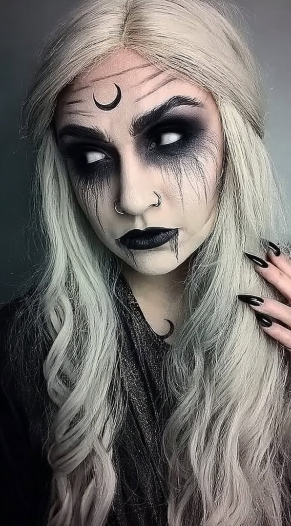 Platinum waves paired with dramatic lunar-inspired face makeup create a dark moon goddess witch hairstyle where the hair and the makeup share equal responsibility for the overall impact.