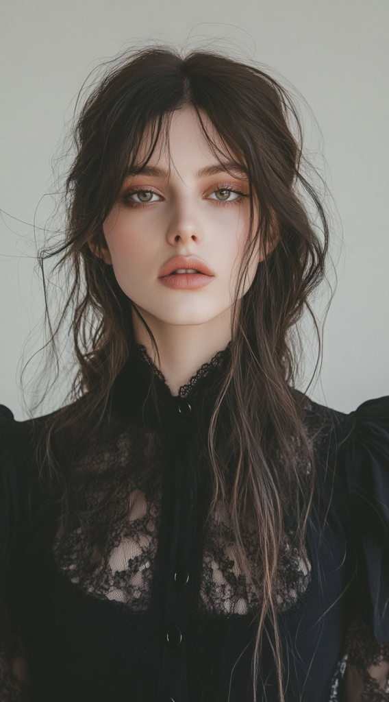 Messy face-framing layers with a middle part create a contemporary, low-effort witch hairstyle that works well for those who want a modern rather than traditional interpretation of the character. The dishevelment here is intentional — it reads as someone who’s been busy casting spells rather than simply not styling their hair.