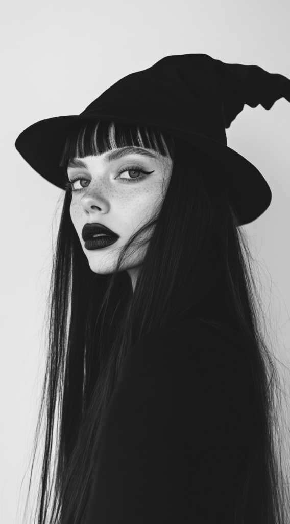 A short bob with blunt bangs and a medium-height witch hat creates a clean, modern witch hairstyle that doesn’t sacrifice personal style for the sake of a costume. The geometric precision of the blunt bangs pairs naturally with the angular shape of the hat.