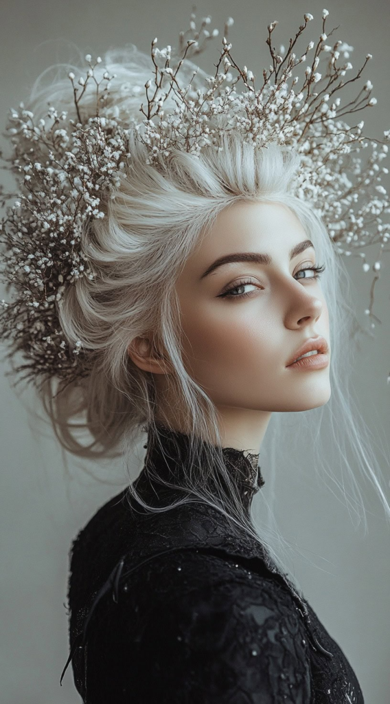 A voluminous platinum blonde updo adorned with delicate winter twig accessories creates a fairy-like, frost-touched witch hairstyle that works particularly well for lighter hair colors. The accessories suggest cold, sparse winters rather than warm, lush forests — a distinct aesthetic that separates this look from standard nature witch styles.