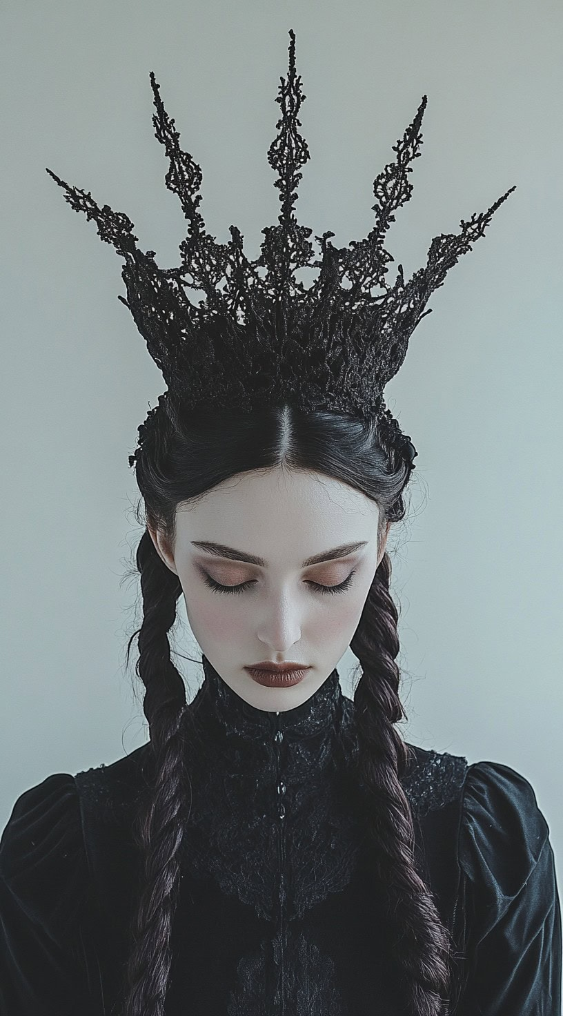 Thick, pancaked twin braids sweeping from a middle part and meeting at the back, finished with a black lace crown, create a bold gothic royalty witch hairstyle. The volume in the braids is what separates this from a standard two-braid style — flat, tight braids won’t carry the same visual weight.