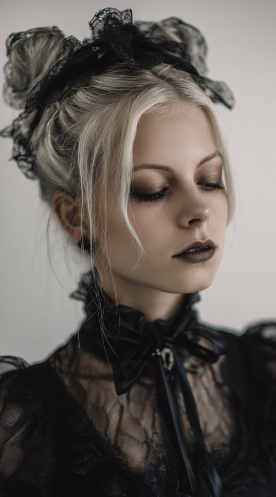 Platinum blonde space buns with black lace woven through them deliver a witch hairstyle that sits at the intersection of cute and eerie. The lace elevates what could be a simple style into something genuinely character-specific.