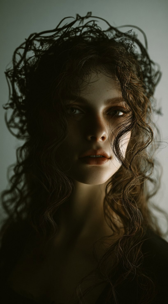 Long, free-flowing waves topped with a twisted natural-looking twig crown create a bohemian forest witch hairstyle that feels earthy and genuinely untamed. The organic crown is the key detail — it should look foraged, not manufactured.