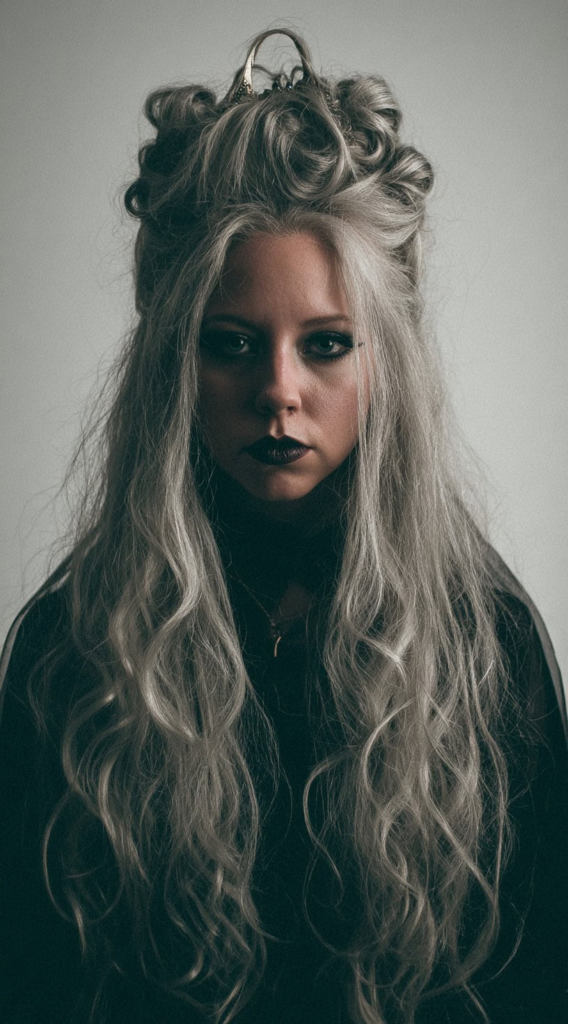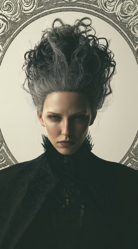 An exaggeratedly tall silver updo with wild, teased texture creates a sculptural witch hairstyle that’s all about presence and power. This is a look built for impact — there’s nothing subtle about it, and that’s entirely the point.