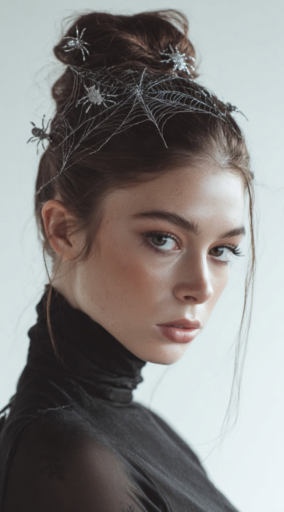 A classic high bun draped with a silver spiderweb accessory and small glittering spider decorations creates a clever, elegant-yet-spooky witch hairstyle. The accessory does the Halloween storytelling while the bun stays polished underneath.