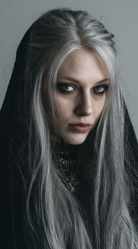 Long, straight silver hair with a clean middle part worn under a black hood creates a brooding, minimalist witch hairstyle where simplicity is the strength. The hood handles the drama while the hair stays clean and intentional.
