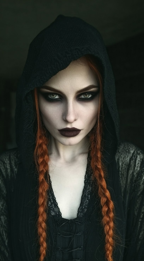 Straight, vibrant red braids worn under a dark hood create a dramatic, simple witch hairstyle where the color contrast between the fiery braids and the dark fabric does all the work.